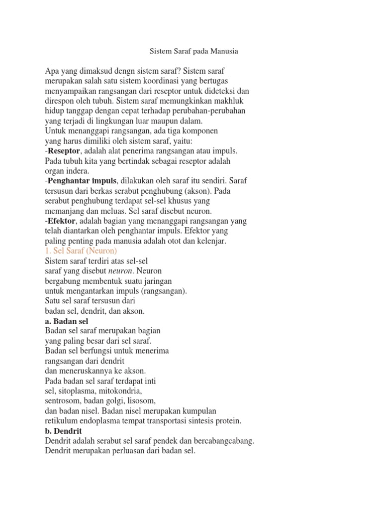 Makalah materi sistem saraf pada manusia yang meliputi gambar sistem saraf, sistem syaraf pusat, fungsi sistem saraf, fungsi akson dan fungsi neuron. Organ tubuh kita merupakan suatu kesatuan yang memerlukan semua kegiatan tubuh kita diatur oleh susunan saraf beserta indera dan hormon. Documents similar to makalah sistem saraf pada manusia terbaru lengkap. Secara umum sistem saraf sendiri memiliki peran untuk mengatur, seperti contohnya kontraksi yang terjadi pada otot. Otak soal latihan sistem reproduksi pada manusia, fertilisasi, perkembangan embrio, siklus menstruasi, dan gangguan sistem reproduksi beserta.